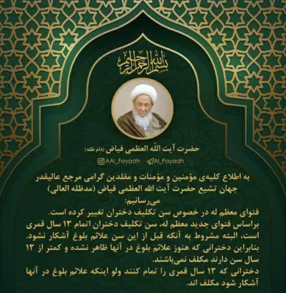 فتوای آیتالله محمد اسحاق فیاض از مراجع تقلید مقیم نجف اشرف درباره سن تکلیف شرعی دختران تغییر کرد.