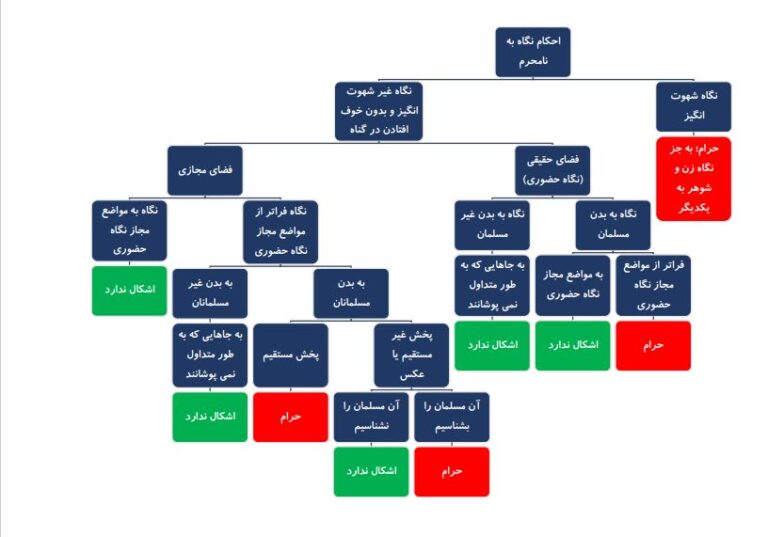 نمودار زیر، جمع بندی کاملی نسبت به احکام نگاه به جنس مخالف در فضای واقعی و مجازی را نشان میدهد.