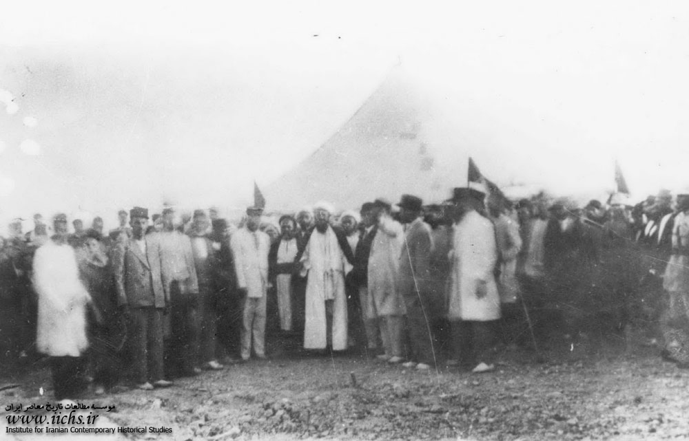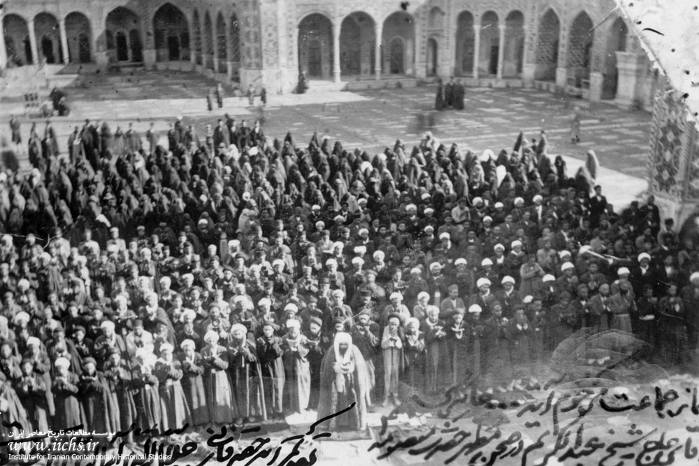 آیت الله العظمی حاج شیخ عبدالکریم حائری به هنگام اقامه نماز عید فطر در صحن حضرت معصومه(س)درقم.درتصویر آیت الله حاج میرزا عبدالله چهلستونی و حجت الاسلام والمسلمین حاج میرزا مهدی بروجردی دیده می شوند