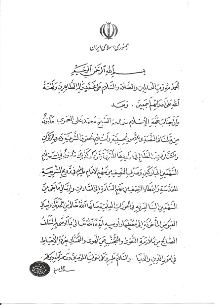وکالت رهبر معظم انقلاب به مرحوم آیتﷲ عمری