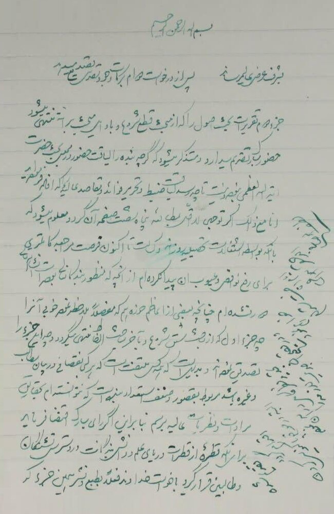 بنابراین اگر رای مبارک اقتضا فرماید برای آن‌که قطره‌ای از قطرات دریای علم و دانش بندگان در دسترس تشنگان و طالبین قرار گیرد با خواست خداوند فعلاً به طبع و نشر همین‌ جزء که تقدیم شده اقدام گردد البته در موقع پاکنویس کردن تجدید نظر کامل در آن نموده ‌و در تصحیح آن جدیت لازمه را خواهم نمود.