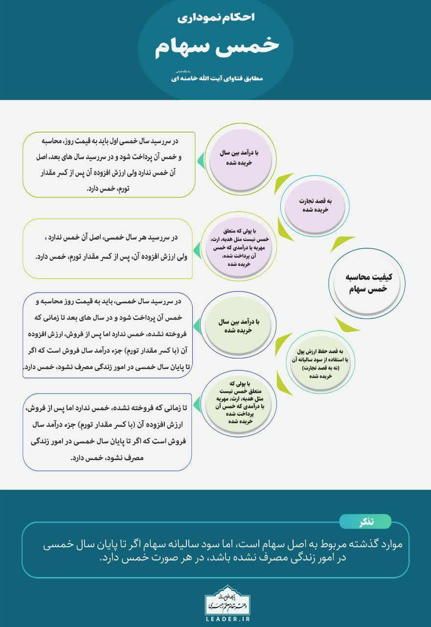 احکام نموداری خمس سهام 1399-04-30 شبکه اجتهاد: نمودار ذیل احکام خمس سهام مطابق با فتوای مقام معظم رهبری آیتالله خامنهای میباشد که کیفیت محاسبه آن طراحی شده است.