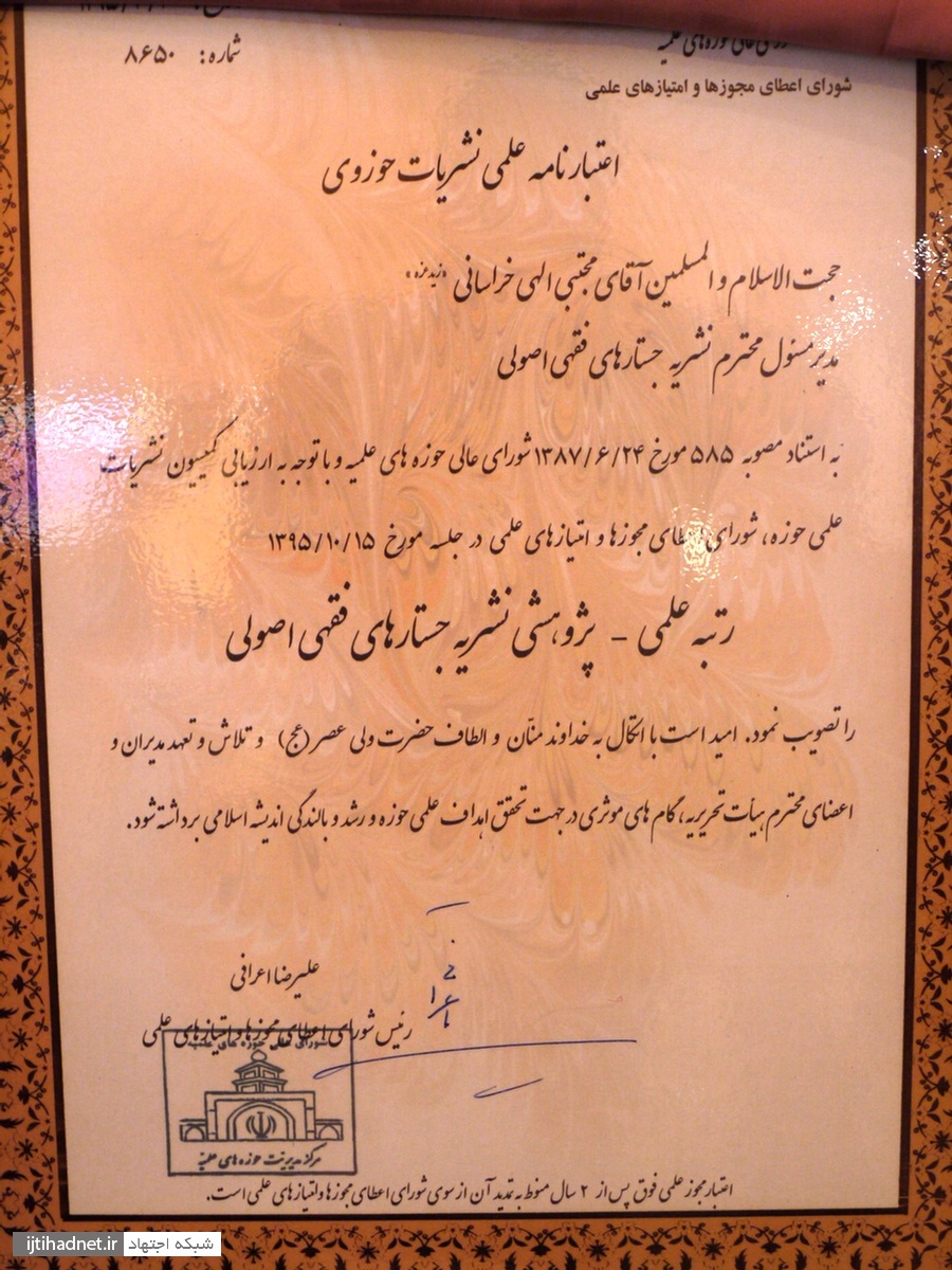 شبکه اجتهاد: همزمان با نشست تخصصی «شیوه مواجهه فقه با علوم و عرصههای جدید در مطالعات بینرشتهای، مطالعات نظام سازی و مسائل مستحدثه» با ارائه حجتالاسلام والمسلمین ابوالقاسم علیدوست استاد خارج فقه و اصول و عضو جامعه مدرسین حوزه علمیه قم؛ مراسم رونمایی رسمی از فصلنامه علمی پژوهشی «جستارهای فقهی و اصولی» که بهتازگی از سوی شورای اعطا مجوز حوزه علمیه قم موفق به دریافت رتبه «علمی پژوهشی» شده است، با حضور جمعی از علما، محققان فقهی و اصولی و اساتید حوزه و دانشگاه در مشهد برگزار گردید.