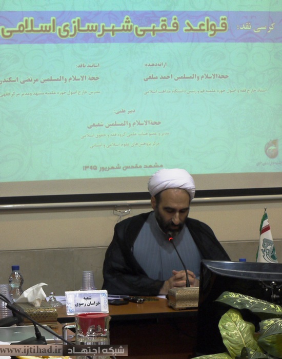به همت گروه پژوهشی فقه کاربردی پژوهشکده اسلام تمدّنی، چهارمین نشست از سلسله نشست‌های «فقه شهر و شهرنشینی» در قالب کرسی نقد با عنوان «قواعد فقهی شهرسازی اسلامی»، با ارائه حجت‌الاسلام والمسلمین احمد مبلغی رئیس دانشگاه مذاهب اسلامی و استاد خارج فقه و اصول حوزه علمیه قم و نقد حجت‌الاسلام والمسلمین مرتضی اسکندری استاد خارج اصول حوزه علمیه مشهد و معاون آموزشی مرکز فقهی ائمه اطهار(علیهم‌السلام) واحد مشهد، در جمع اساتید، فضلا و فقه‌پژوهان، بعدازظهر امروز در دفتر تبلیغات اسلامی خراسان رضوی برگزار گردید.