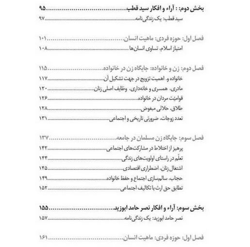 پس از بیان مبسوط مقدمات، چنانکه از فهرست نیز مشخص است، سه فصل آتی کتاب به ترتیب به مرتضی مطهری، سید قطب و نصر حامد ابوزید تخصیص یافته است. در هر فصل ضمن بیان زندگینامهی اجتماعی هر اندیشمند و تبیین خطوط اصلی اندیشه و روششناسی وی و تحولاتی که وی را بهسوی نظریهپردازی اختصاصی سوق داده است، جایگاه و موقعیت زنان مسلمان در جوامع اسلامی در سه حوزهی کلانِ «فردی»، «خانوادگی» و «اجتماعی» (سه حوزهای که بخش اعظمی از حیات اجتماعی انسان در جامعه را پوشش میدهند) در اندیشهی او به نحوی مستند تبیین و تحلیل شده است. پرداختن به مقولاتی حساس و مهم و زنده همچون: موقعیت و جایگاه زنان، تساوی انسانها، مادری و همسری و خانهداری، قوامیّت، طلاق، تعدد زوجات، حدود مشارکت اجتماعی، اشتغال، حجاب، حق ارث و… بخش مهمی از موارد مطروحه ذیل حوزههای ثلاثهی کلانِ مذکور در اندیشهی هر اندیشمند میباشد که به نحوی منسجم و دقیق به رشتهی تحریر و تحلیل کشیده شده است.