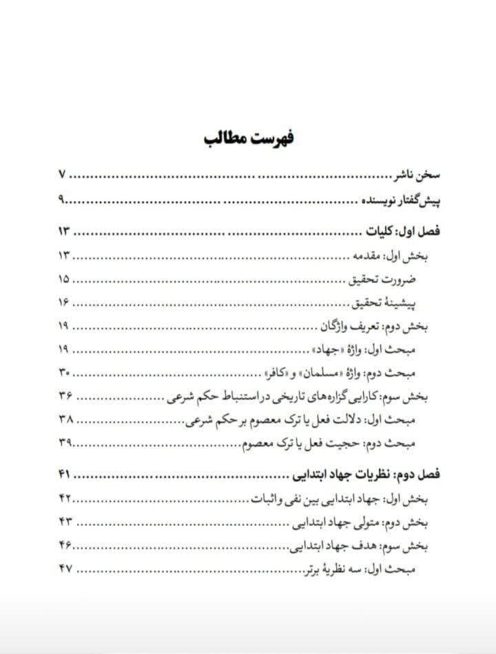 لازم به ذکر است، نظریه جهاد ابتدایی برای ترویج دین، مصونیت‌های جنگی کافران، مبارزه با ریشه محاربه و ناآرامی، جهادهای ترکیبی، قراردادهای صلح و جزیه با مشرکان و اهل کتاب، غزوات پیامبر با مشرکان و اهل کتاب، مبارزه با عناصر محارب یا پیمان شکن و… از جمله مباحثی است که در این کتاب شرح داده شده است.