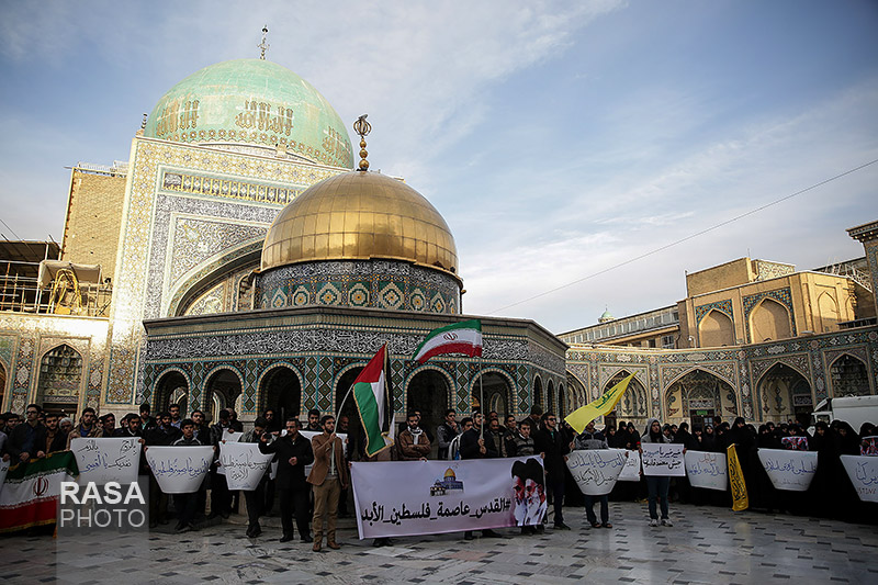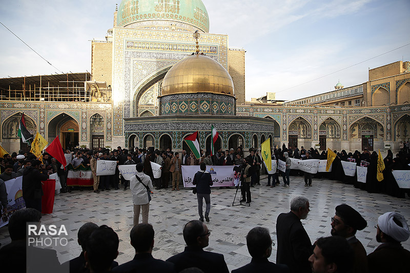 شبکه اجتهاد: زائران و مجاوران بارگاه منور رضوی امروز با ایجاد حلقه انسانی در صحن قدس حرم رضوی، خواستار آزادسازی سرزمین های اشغالی از سلطه رژیم صهیونیستی و هم پیمانانش شدند. در پایان این تجمع شرکت کنندگان با قرائت بیانیه ای حمایت خود را از قدس شریف و مردم مظلوم فلسطین اعلام کردند.