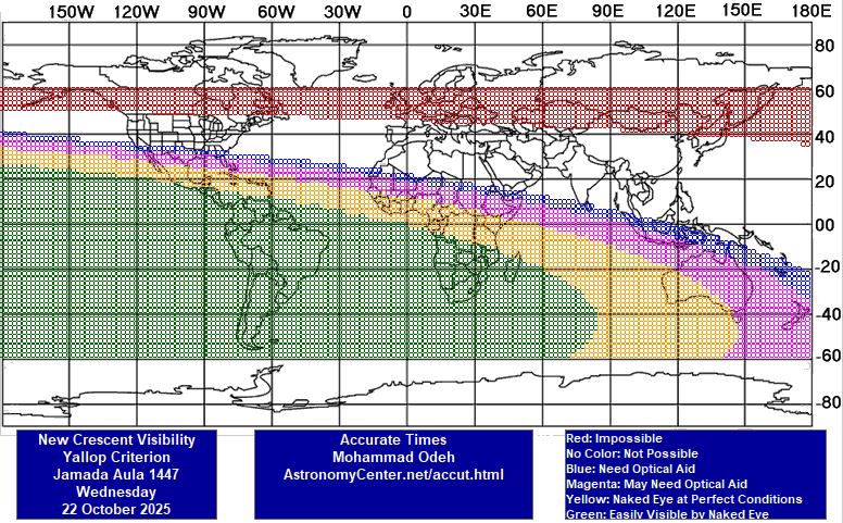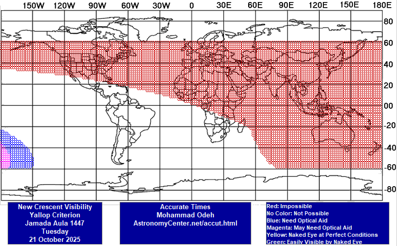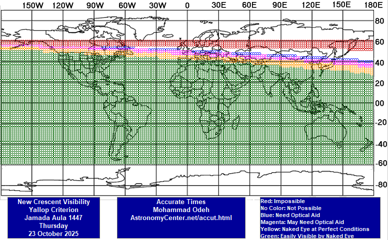 ۲- رؤیت هلال با چشم عادی در غروب چهارشنبه ۳۰ مهر ۱۴۰۴ شمسی برابر با ۲۲ اکتبر ۲۰۲۵ میلادی، در محدودۀ سبزرنگ نقشۀ دو (از جمله: مرکز و شرق اقیانوس آرام، سراسرِ آمریکای جنوبی، اقیانوس اطلس جنوبی، و بخشی از جنوب قارّۀ آفریقا) بهراحتی محقّق میشود؛ از اینرو، برای ایران و همۀ نقاط زمین، پنجشنبه ۱ آبان ۱۴۰۴ شمسی برابر با ۲۳ اکتبر ۲۰۲۵ میلادی، روز اوّل ماه جُمادَیالاُولیٰ ۱۴۴۷ قمری خواهد بود.