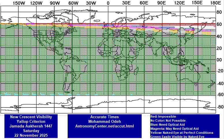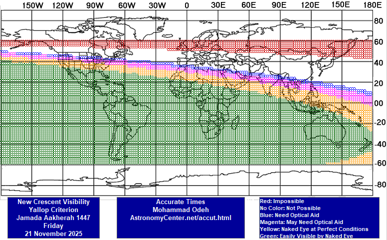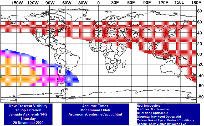 ۱- رؤیت هلال با چشم مسلّح در غروب پنجشنبه ۲۹ آبان ۱۴۰۴ شمسی برابر با ۲۰ نوامبر ۲۰۲۵ میلادی، در سراسرِ ایران، ممتنع و ناممکن است؛ امّا در همین غروب، در محدوده‌های آبی و صورتی و نارنجی و سبزرنگ نقشۀ یک (بخشی از مرکز و جنوب و جنوب‌شرقی اقیانوس آرام، جنوب آمریکای جنوبی، و بخشی از جنوب‌غربی اقیانوس اطلس) هلال مطمئنّاً با چشم مسلّح دیده می‌شود و ایران نیز، در بخشی از شب با آنجا مشترک است؛ در نتیجه، در سراسر ایران، جمعه ۳۰ آبان ۱۴۰۴ شمسی برابر با ۲۱ نوامبر ۲۰۲۵ میلادی، روز اوّل ماه جمادی الثانیه ۱۴۴۷ قمری خواهد بود. / محسن فصاحت