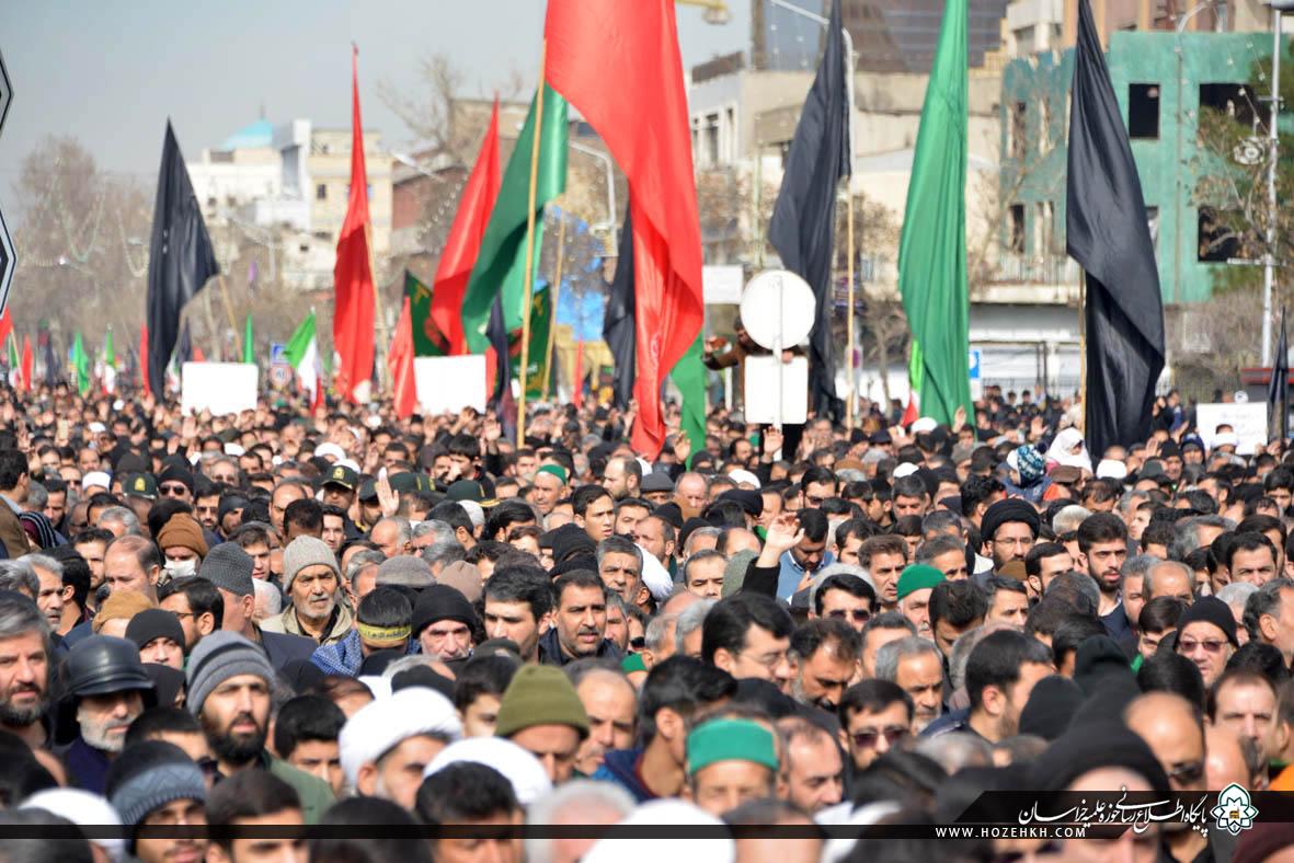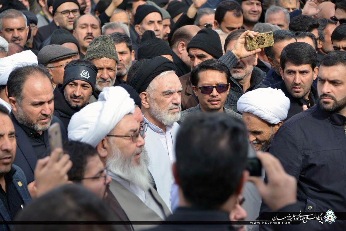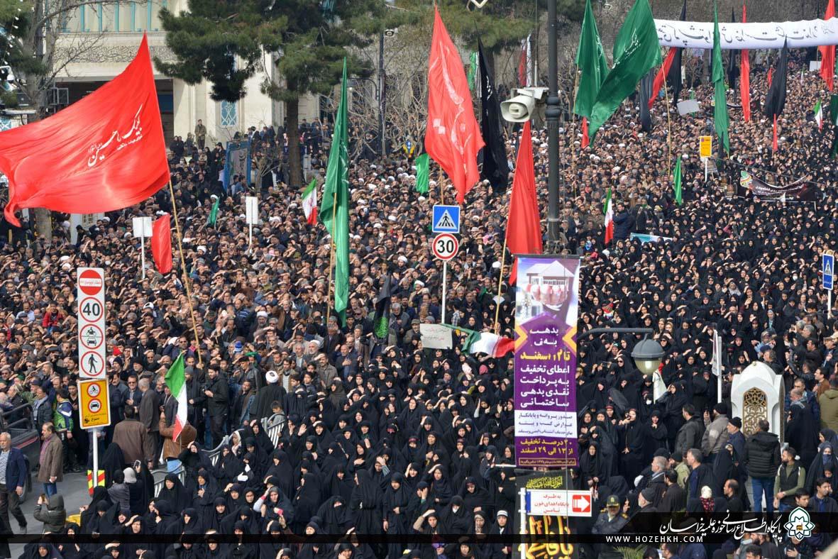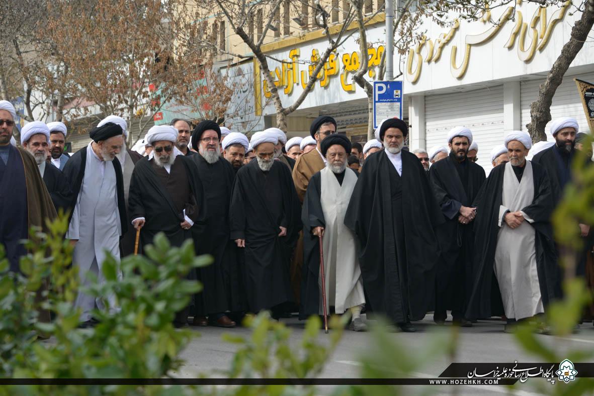 شبکه اجتهاد: مراسم عزاداری سالروز شهادت حضرت صدیقه طاهره سلام الله علیها از سوی شورای عالی و مدیریت حوزه علمیه خراسان، با حضور حضرات آیات، علما، اساتید و روحانیان و با سخنرانی آیتالله سید احمد خاتمی در مدرسه علمیه آیتالله خویی(ره) مشهد برگزار شد. پس از عزاداری علما و اساتید، روحانیون حوزه علمیه خراسان به همراه اجتماع عزاداران فاطمی برای عرض تسلیت به ساحت حضرت رضا (علیهالسلام) به سمت حرم مطهر رضوی مشرف شدند.