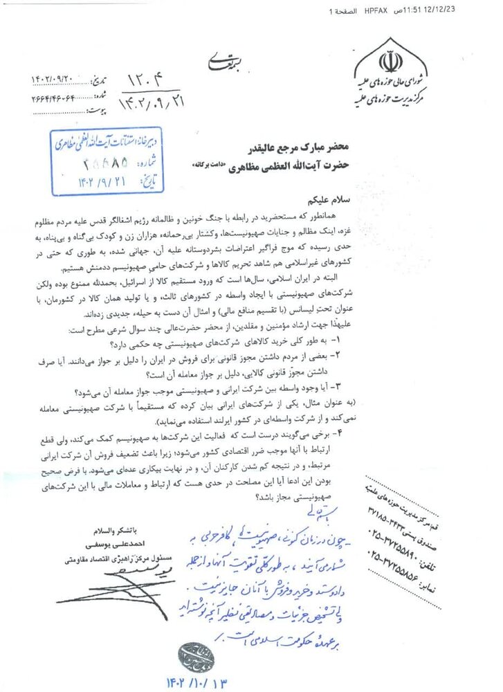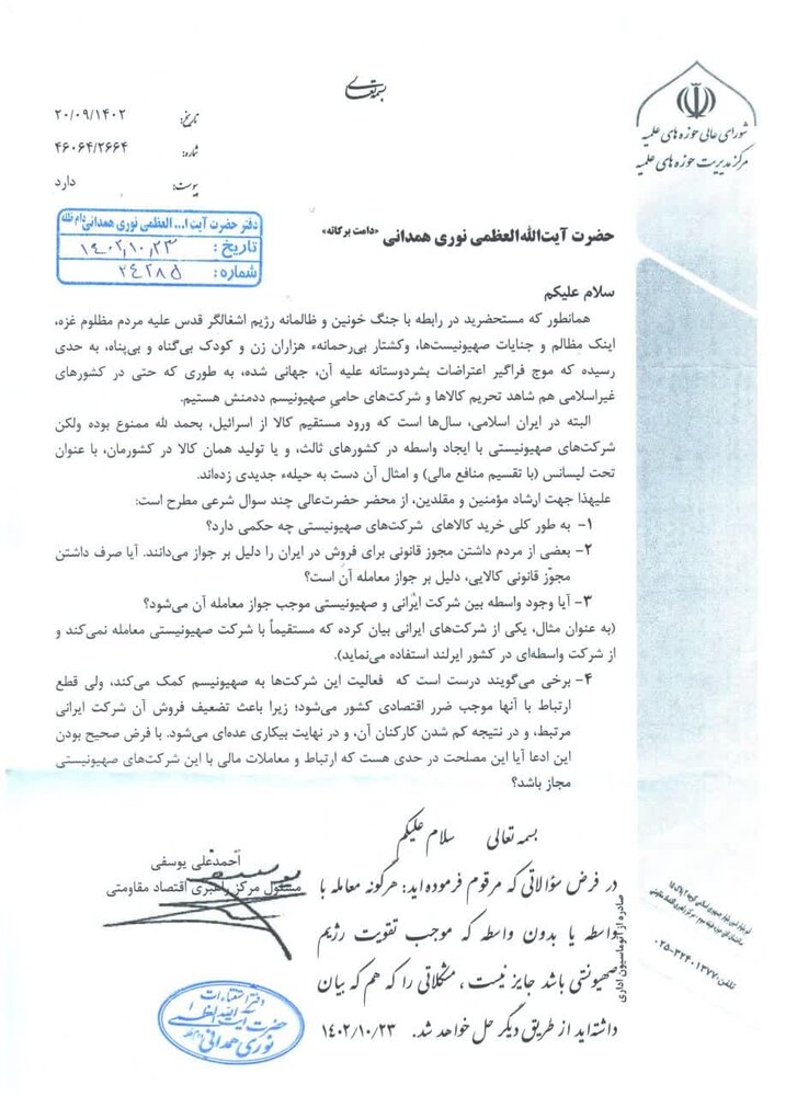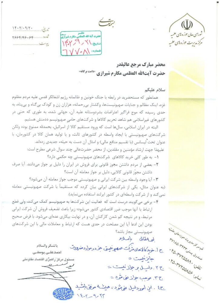 آیات عظام مکارم شیرازی، نوری همدانی، سبحانی و مظاهری پاسخ استفتاء مرکز راهبری اقتصاد مقاومتی حوزههای علمیه درباره خرید با واسطه یا بی واسطه و استفاده از کالاهای شرکتهای صهیونیستی را اعلام کردند.