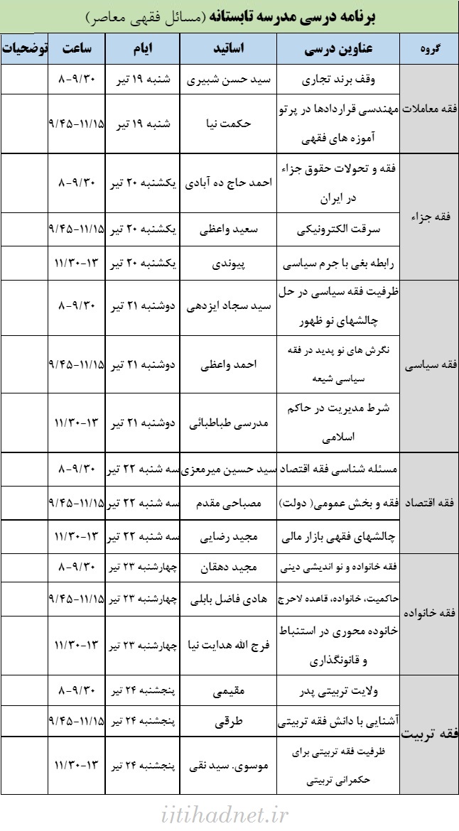 براساس این گزارش مدرسه تابستانی «مسائل فقهی معاصر» به صورت حضوری و مجازی از ۱۹ الی ۲۶ تیرماه ۱۴۰۰، با حضور اساتید مطرح حوزه و دانشگاه در قم، بلوار جمهوری اسلامی، سالن اجتماعات مرکز تحقیقات اسلامی نور برگزار خواهد شد.