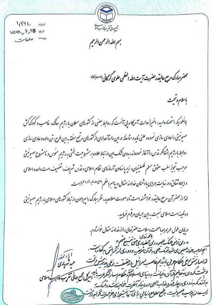 در این نامه که برای تعدادی از مراجع عظام تقلید و علمای اعلام ارسال شده است، ضمن اشاره به اینکه «این ارتباط علاوه بر مشروعیت بخشی به رژیم منحوس و نامشروع صهیونیستی موجب تجویز سلب حقوق مسلم فلسطینیان، زیر پا نهادن آرمانهای نظام اسلامی و قدس شریف، تضعیف امت واحد اسلامی و ایجاد شقاق و در نهایت همراهی با دشمنان خداوند متعال و پیامبر اعظم (ص) است»، در خصوص عادی سازی روابط با رژیم صهیونیستی از محضر مراجع معظم استفتاء شده است.