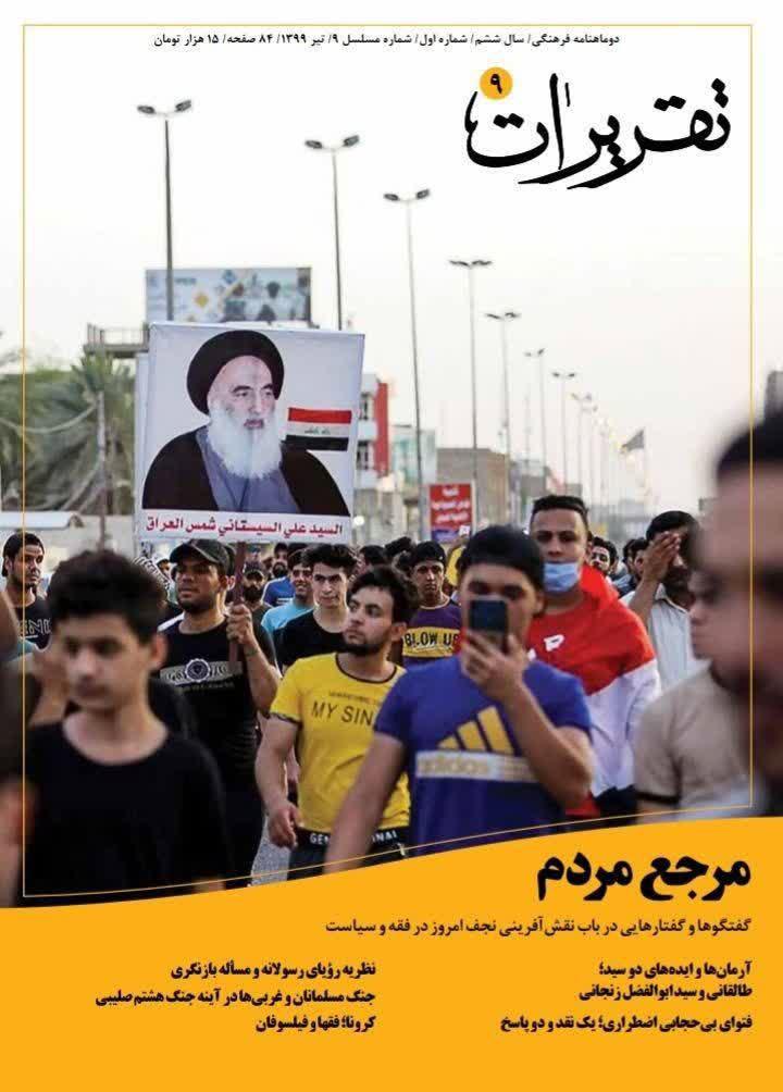 نهمین شماره دوماهنامه «تقریرات» با گفتگو و گفتارهایی در باب «نقش آفرینی نجف امروز در فقه و سیاست» و مطالب دیگری چون «آرمانها و ایدههای دو سید؛ طالقانی و سید ابوالفضل زنجانی»، «فتوای بیحجابی اضطراری؛ یک نقد و دو پاسخ»، «نظریه رؤیای رسولانه و مسأله بازنگری»، «جنگ مسلمانان و غربیها در آینه جنگ هشتم صلیبی» و «کرونا؛ فقها و فیلسوفان»؛ چاپ و در پیشخوان مطبوعات قرار گرفت.