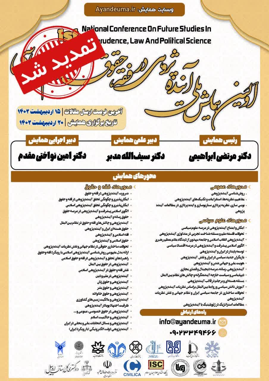 اولین همایش ملی «آینده پژوهی در فقه، حقوق و علوم سیاسی» با حمایت موثر ارگانها، سازمانها و مجامع علمی و دانشگاهی در اردیبهشتماه ۱۴۰۲ در دانشگاه محقق اردبیلی برگزار خواهد شد.