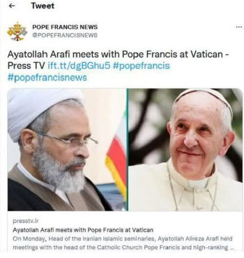رهبر کاتولیکهای جهان، افزود: تا حد زیادی با معارف شیعی آشنا هستم و صحبتهای شما در این زمینهها را قبول دارم. او درباره سخنان استاد اعرافی پیرامون رابطه ملک و ملکوت و ضعیف شدن آن گفت: این مسئله یکی از مسائل مهم بشر است و همه ما باید به آن بپردازیم.