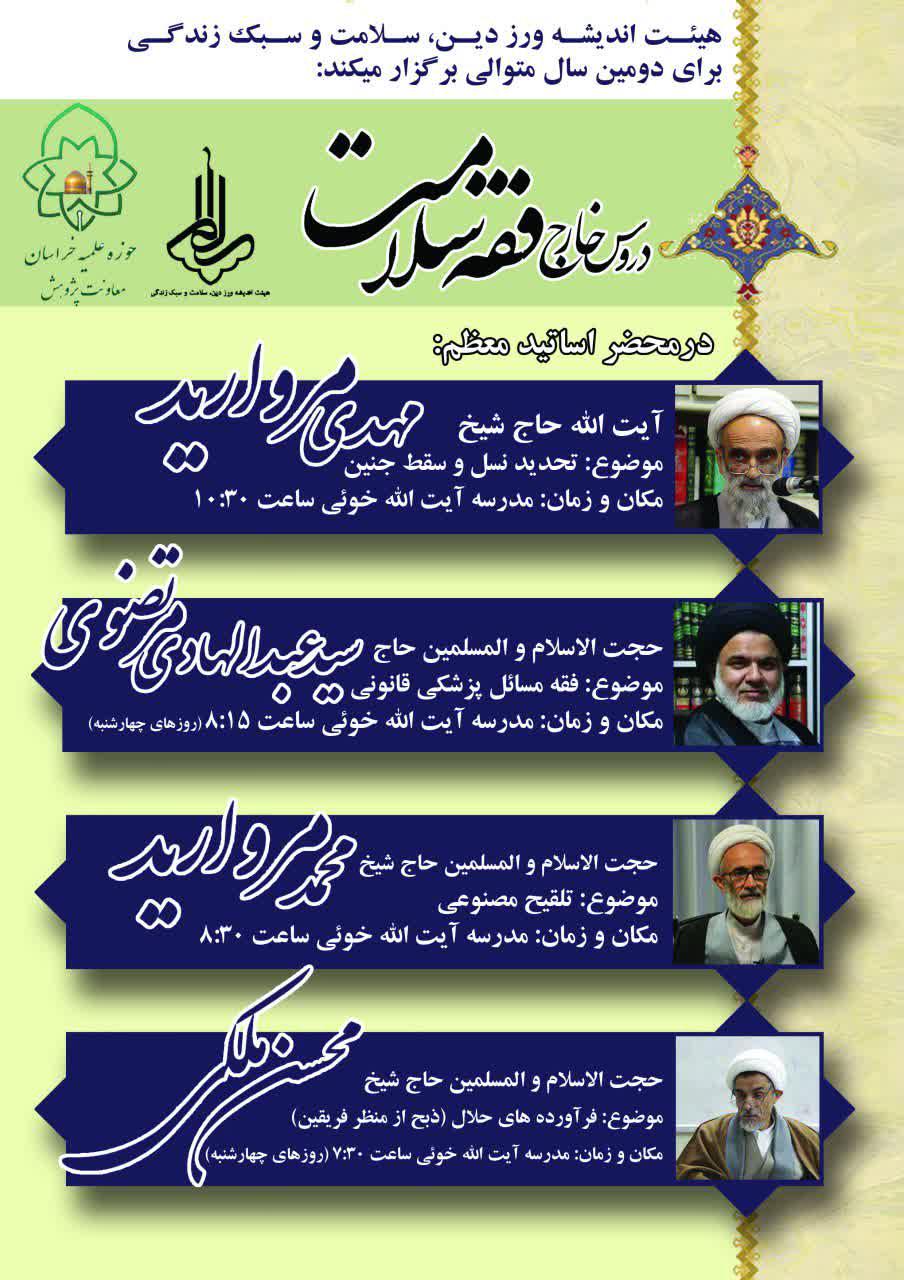 در راستای دغدغهمندی و احساس تکلیف نسبت به ضرورت طرح مسائل مستحدثه عرصه فقه سلامت در جامعه امروز، بخصوص مسائل مورد ابتلای جامعه همچون سقط جنین، تلقیح مصنوعی و مسائل مرتبط با حیطه پزشکی قانونی و فرآوردههای حلال؛ هیئت اندیشه ورز «دین، سلامت و سبک زندگی» حوزه علمیه خراسان اقدام به برگزاری دروس خارج در این حوزه نموده است.
