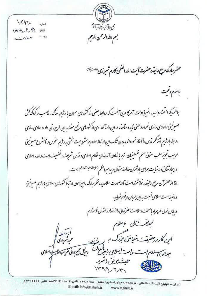 در این نامه که برای تعدادی از مراجع عظام تقلید و علمای اعلام ارسال شده است، ضمن اشاره به اینکه «این ارتباط علاوه بر مشروعیت بخشی به رژیم منحوس و نامشروع صهیونیستی موجب تجویز سلب حقوق مسلم فلسطینیان، زیر پا نهادن آرمانهای نظام اسلامی و قدس شریف، تضعیف امت واحد اسلامی و ایجاد شقاق و در نهایت همراهی با دشمنان خداوند متعال و پیامبر اعظم (ص) است»، در خصوص عادی سازی روابط با رژیم صهیونیستی از محضر مراجع معظم استفتاء شده است.